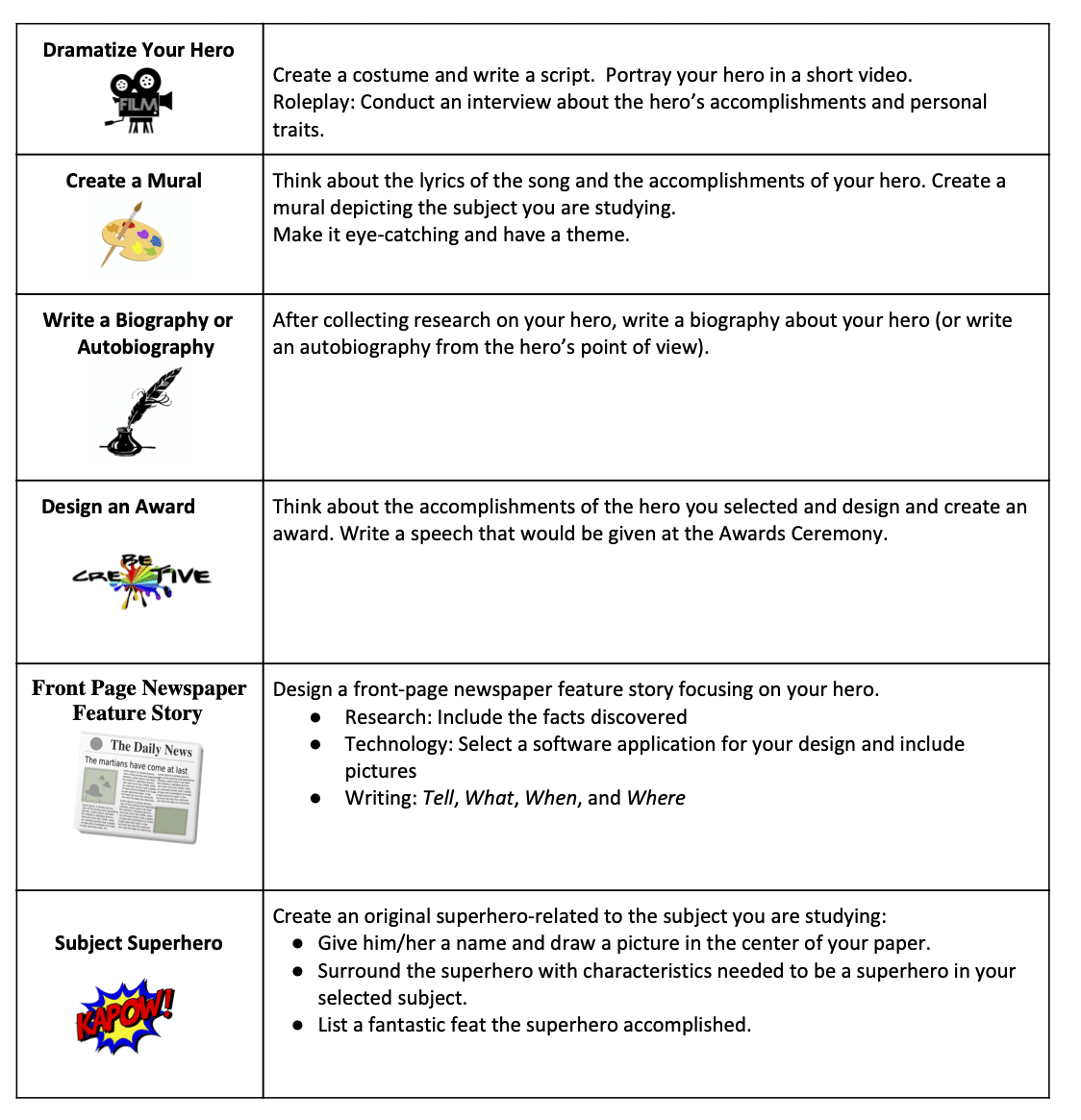 4. Instruct students to select a hero (she-ro) from their identified list, conduct research to learn more about him/her, and then choose one of the following projects listed. Each project must include the following criteria: